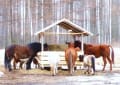 パドックの掃除中 散らかった乾草を集めると馬達も集まってきて食べ始めます