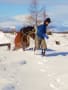 ①朝の飼い葉 昨日の吹きだまりを越えてくるボンちゃんと旦那