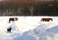 ①気温が上がると雪融けも進み サラブレッドたちのシェルター前は小川