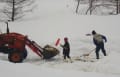 ①自分が山羊たちのシェルターの屋根の雪を突っついていると