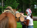 馬と農業を勉強しているはなちゃん 今回は馬の背に荷物を乗せる技術