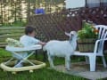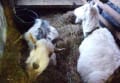 お昼寝のサラと大豆 草を食べているのはレオ